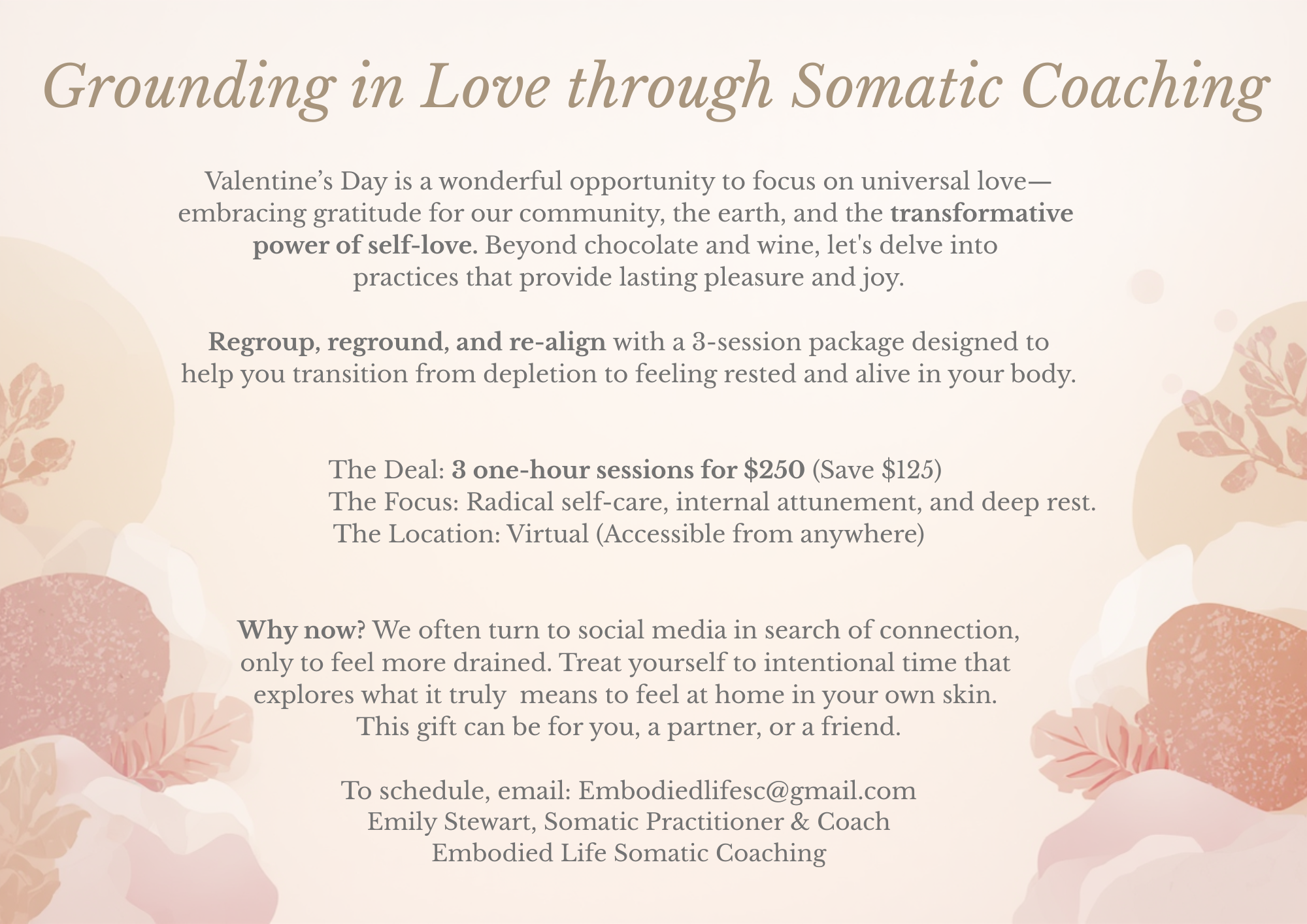 To honor this season of love, I’m offering a special opportunity to regroup, reground, and realign. This 3-session package is designed to help you explore what it truly means to feel at home in your own skin.